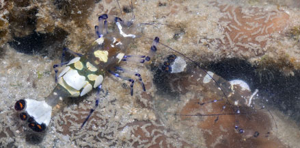 seen? This chubby shrimp with black-ringed orange spots on its tail is often