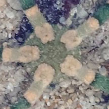 smooth. Arms somewhat cylindrical, smooth (not as bristley as other brittle stars) towards the end, tapers to a sharp point. Underside plain pale or white. Arms seem to be made up of articulated scale-like structures. On pale orange arms, bold banded pattern of olive green with darker green edge. Central disk with varying patterns, some with one or more bright red spots.