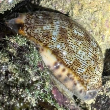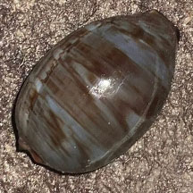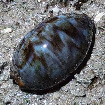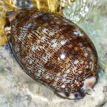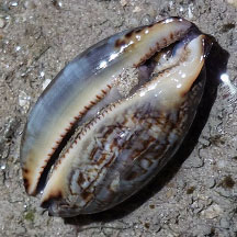 generally bluish with pattern of fine dotted brown lines, but patterns vary. Underside pale beige to light orange with brown spots and brown or orange 'teeth'. The living animal has a mantle covered with fine white 'hairs'. Siphon and tentacles black. So far, we have not encountered a living animal with the mantle covering the entire shell. |