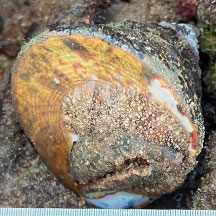 8-15cm. The largest of our top shells, shell thick, heavy, a sharp-pointed cone, with spirals of bumpy ridges. Upperside orangey