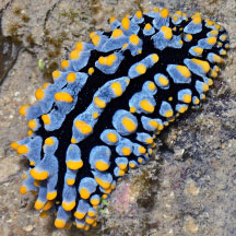 tipped yellow. The short rhinophores are orange. On the underside, there is a dark stripe or line of dark dots/dashes