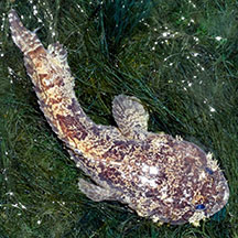 Baby toadfishes: According to the Encyclopedia of Life, males call mates to their nest with croaking, hooting, grunting and humming sounds they make using their swim bladder; toadfish also make (different) noises when threatened. In some species, male looks after the eggs after they are laid in the nest on on ceilings of narrow or low overhangs of rock or rubble. The male protects the embryos until they are self-sufficient, about 3-4 weeks. WE have observed an adult toadfish with many tiny fishes under the shelter of a rock. |