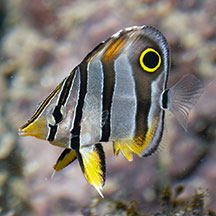 4 bands which are orange or yellow edged in black and white. White-ringed black eye spot on the dorsal fin, white-edged black bar at the base of the tail. The