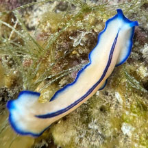 seen? This small pale flatworm elegantly edged in blue with a central blue stripe is regularly