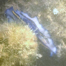 Features: 2-4cm long. Body white or bluish becoming dark blue at the margin. It has three non-connecting lines along the centre of the body, each line yellow with a fine blue border. Has a pair of all blue pseudotentacles (no coloured tips) made up of simple folded edges