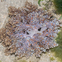 animal about 1cm wide. 5-6 arms with very small spines, held flat, along the sides of the arm. Uniformly bright orange. Sometimes confused with the Tiny colourful brittle star which are more colorful and found on a wider variety of animals. |