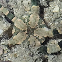 smooth. Arms somewhat cylindrical, smooth (not as bristley as other brittle stars) towards the end, tapers to a sharp point. Underside plain pale or white. Arms seem to be made up of articulated scale-like structures. On pale orange arms, bold banded pattern of olive green with darker green edge. Central disk with varying patterns, some with one or more bright red spots.