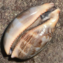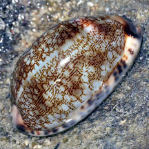generally bluish with pattern of fine dotted brown lines, but patterns vary. Underside pale beige to light orange with brown spots and brown or orange 'teeth'. The living animal has a mantle covered with fine white 'hairs'. Siphon and tentacles black. So far, we have not encountered a living animal with the mantle covering the entire shell. |