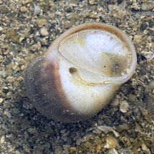 the underside, a small depression. Operculum white with with a dark smudge where the whorl begins, a pair of spiralling