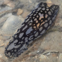 tiny internal shell. The black-and-white pattern can vary widely: from a black network on a white background, to white spots on a black background. The pattern extends onto the inside of