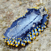 tipped yellow. The short rhinophores are orange. On the underside, there is a dark stripe or line of dark dots/dashes