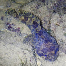 in the open, they look like algae-covered stones. At night, the fish is often spotted by its large eyes that 'shine' red in our torch. Sometimes seen dry out of water at low tide, under large stones, such fishes are still very much alive. There is no need to 'save' them or move them.