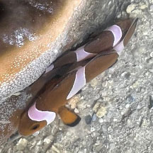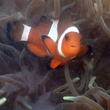 The anemonefish may sometimes be seen stranded at low tide near its anemone home. It is probably best to leave it alone and NOT try to 'rescue' it by putting it in a pool of water far away from its anemone home. These fishes are adapted to surviving at low tide and it is best that they are are close as possible to their anemone home when the tide turns. As the water rushes in, so do predators which will quickly eat up a defenceless anemonefish far from its protective anemone. |